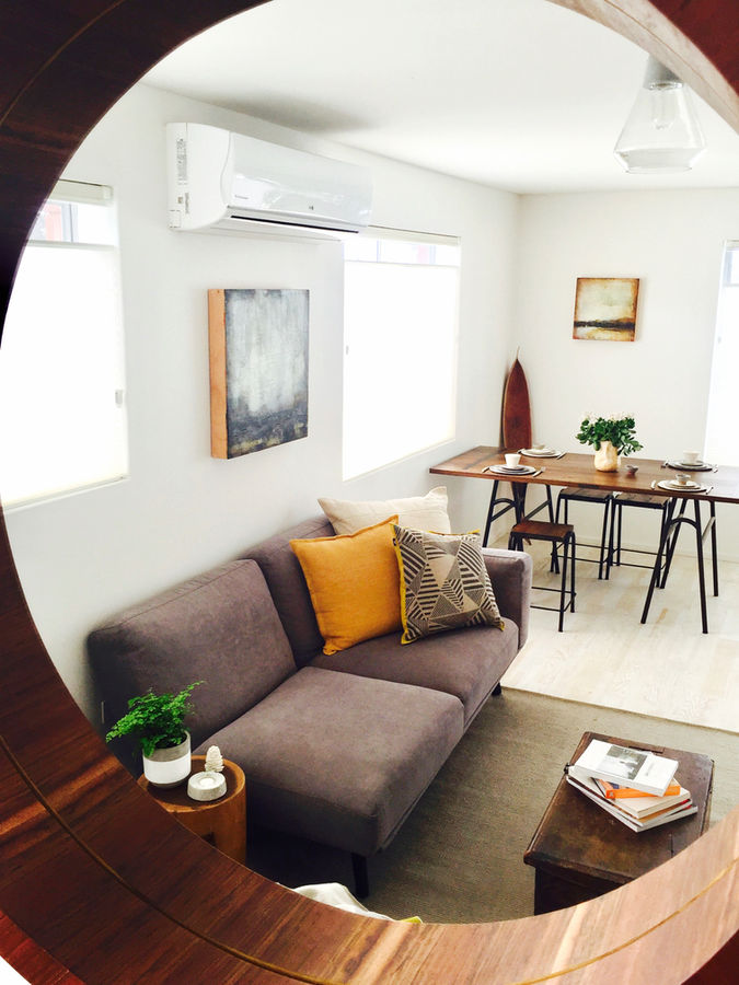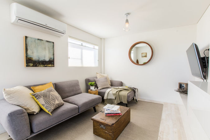 This property was renovated then styled for sale 2 years later. The renovation involved repositioning the kitchen making it more centralised with a long work bench that seperated the living and hallway. Its minimalistic joinery makes for modern lines but also sits quietly so to not take over in the compact space . The separate laundry and bathroom were opened up and incorporated to provide more space. The aesthetic throughout the unit was made light and airy with all walls, ceiling and joinery painted in Dulux Lexicon Quarter, supported by a white washed vinyl plank flooring in the living areas and a light grey carpet in the bedrooms. Cellular Viewscape blinds were installed throughout to link with the minimalist style and to provide privacy and light flexibility.